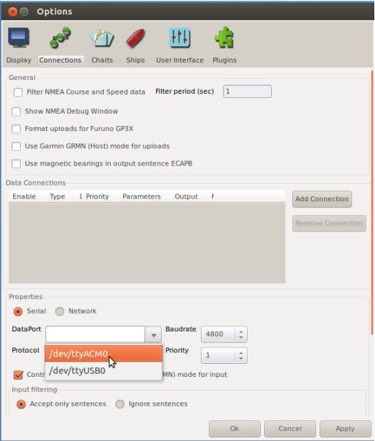 A continuación, abra OpenCPN, vaya a configuración y haga clic en la pestaña de conexiones. Haga clic en añadir conexión “Add connection”, y seleccione conexión serial “Serial”. Haga clic en la lista desplegable junto a “Data Port” y elija el equipo de Digital Yacht.