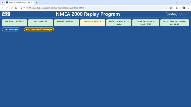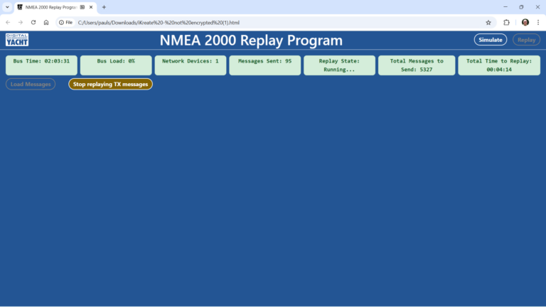 Haga clic en el botón marrón START REPLAYING TX MESSAGES y el estado REPLAY STATE cambiará a Running y el cuadro de estado MESSAGES SENT comenzará a contar. Todos los PGN capturados del archivo log se transmitirán a la velocidad de actualización y en el momento registrados en el archivo de registro. Además, los PGN aparecerán como enviados por los dispositivos con las mismas direcciones SRC que tenían en la red de la que se tomó el archivo de registro.