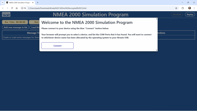 Tan pronto como se detecte un iKreate USB, el simulador de datos NMEA 2000 mostrará una página de simulación en blanco: