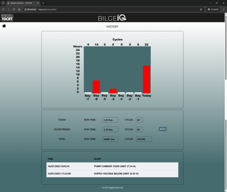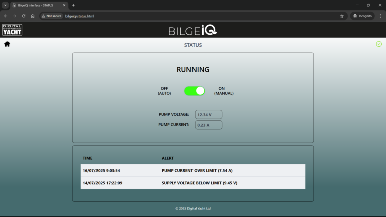 Además, Bilge IQ cuenta con una interfaz WiFi que permite conectar un teléfono o una tablet y mostrar un historial del funcionamiento de la bomba de sentina. Muestra el consumo eléctrico en tiempo real para indicar que la bomba funciona correctamente. Las alertas estándar también permiten una supervisión remota.