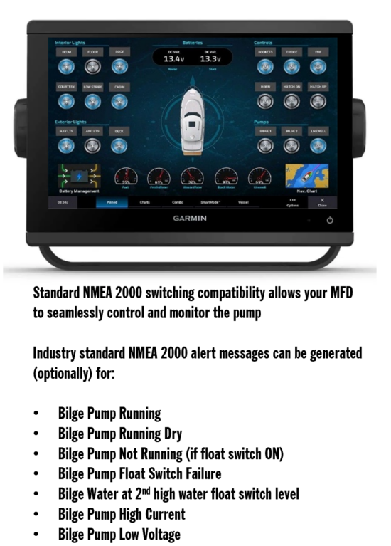 - Controle y supervise su bomba de sentina via su MFD y su móvil o tablet (via NMEA 2000 y WiFi).