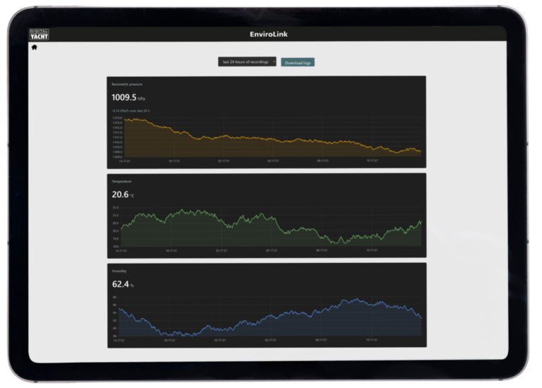 También se registran las tendencias de presión, temperatura y humedad. Los datos se recopilan y almacenan localmente mediante un sensor de precisión, por lo que no es necesaria una conexión a Internet ni la instalación de aplicaciones propietarias. EnviroLINK funciona de forma autónoma en su embarcación, proporcionando la mejor información sobre el tiempo local.