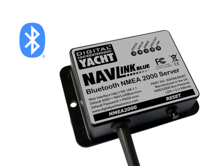 NavLINK Blue es una interfaz de sensores Bluetooth a NMEA 2000, diseñada y fabricada por Digital Yacht. Se conecta fácilmente a sensores Bluetooth de terceros y proporciona una salida de datos NMEA certificada para la red NMEA 2000 de la embarcación, independientemente de la marca.