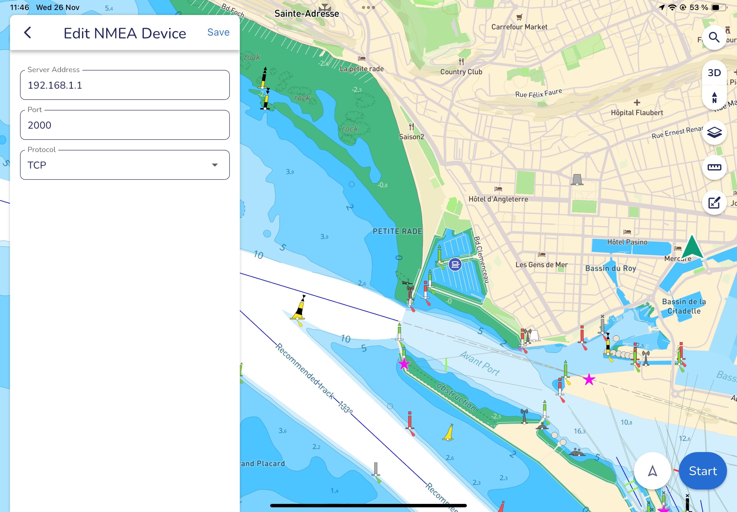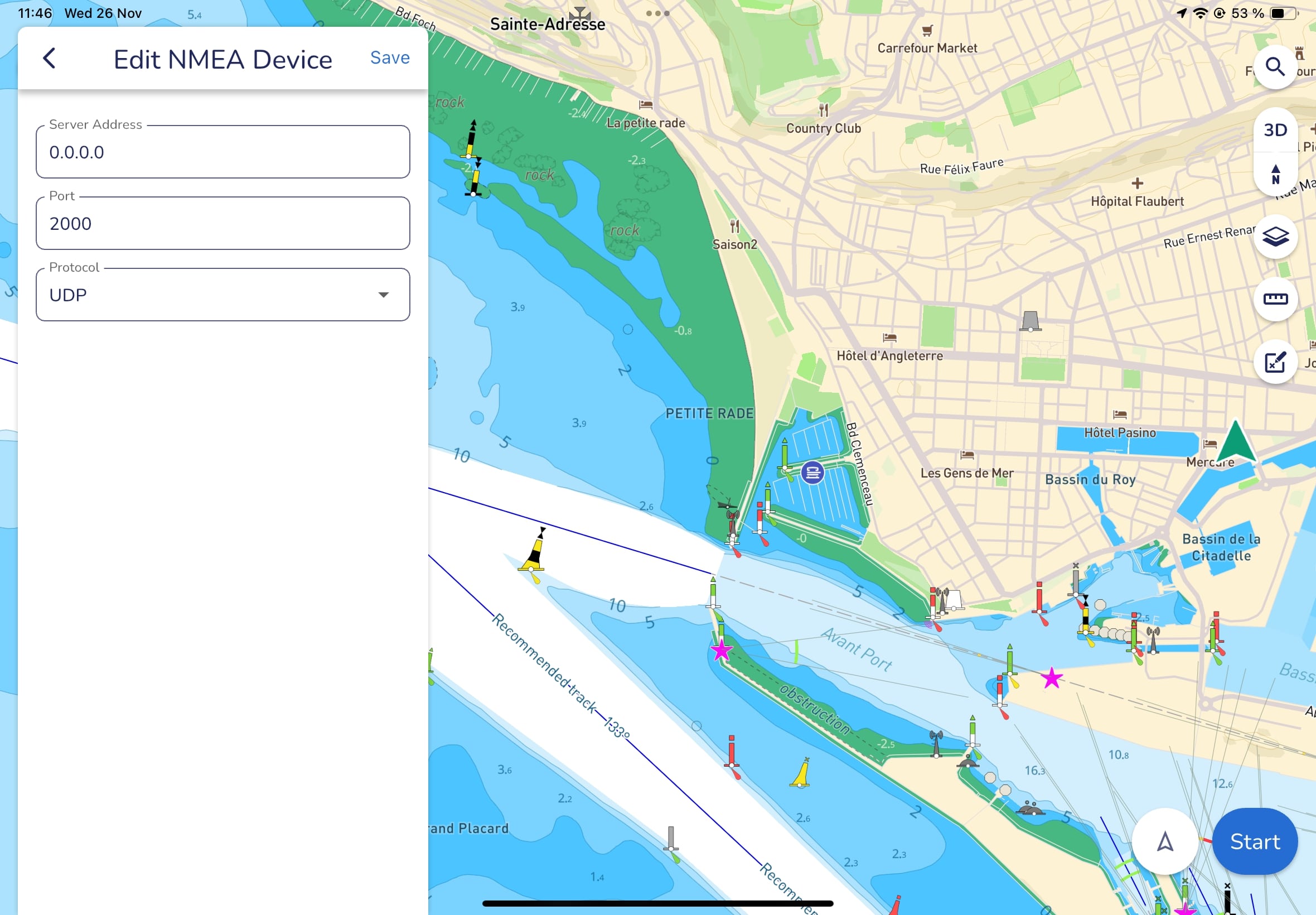 También puede elegir recibir la posición GPS desde el GPS interno de su dispositivo o desde una fuente externa (es decir, una antena GPS conectada a nuestro conversor NMEA a WiFi o la posición GPS de su transpondedor AIS). También puede configurar las entradas y salidas NMEA si por ejemplo quiere transmitir datos a un piloto automático.