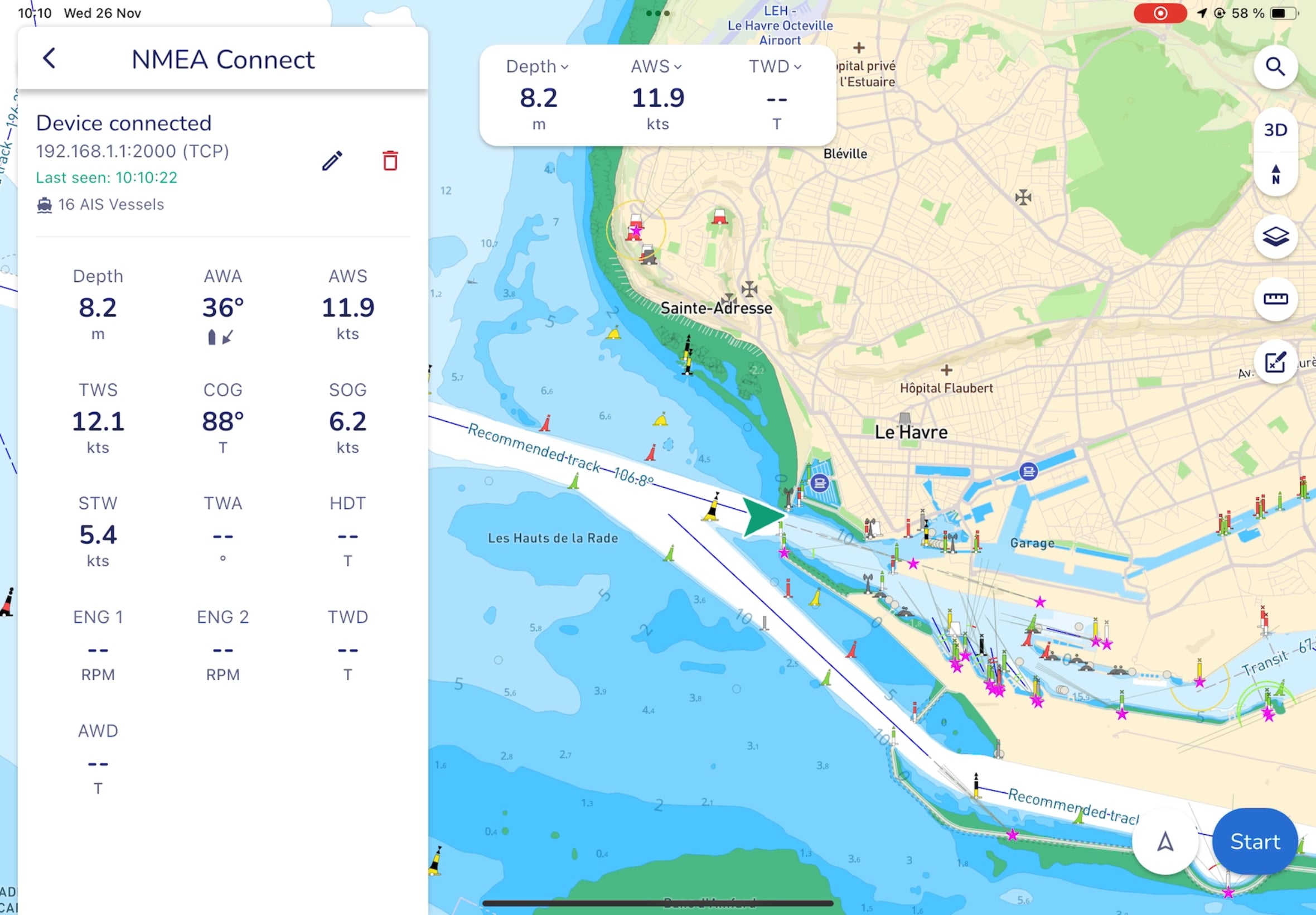 A continuación, comenzará a recibir datos NMEA y AIS en savvy navvy en tiempo real, incluyendo profundidad, velocidad, viento, posición e incluso información del motor.