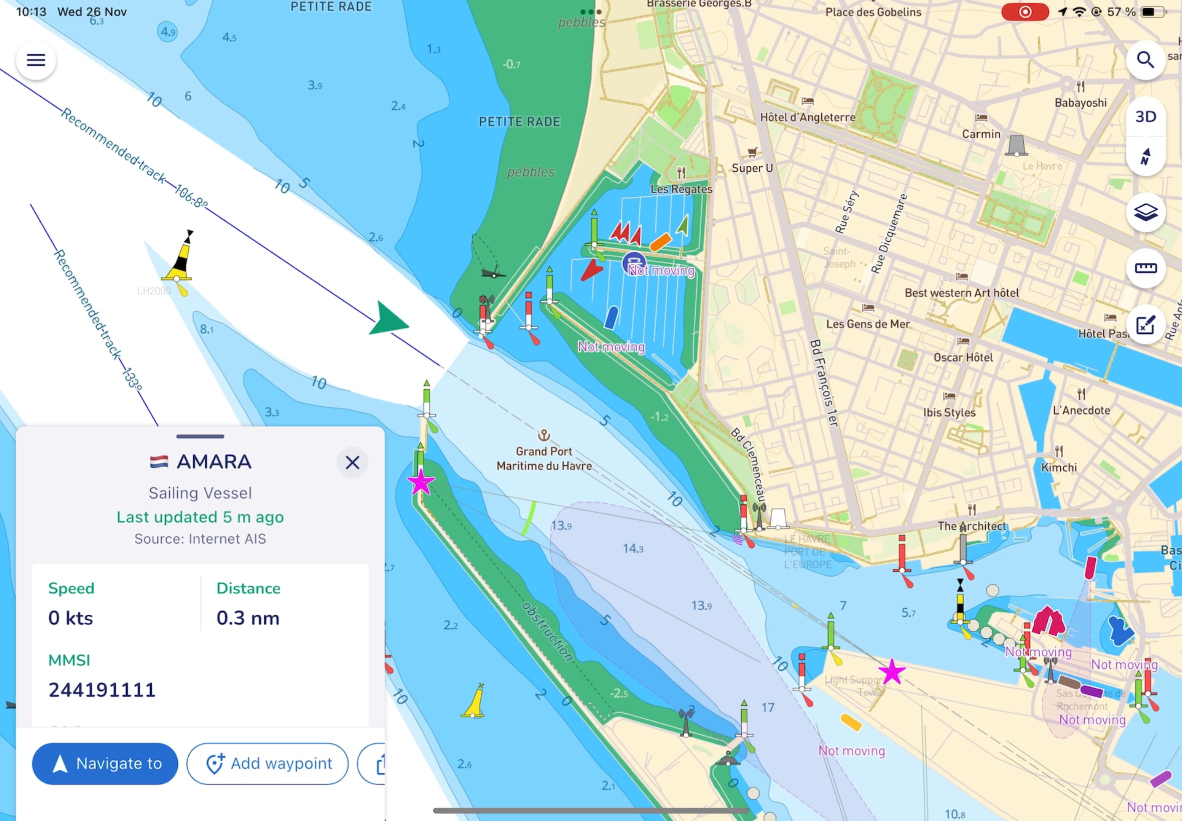 Ahora los objetivos AIS se superpondrán en su cartografía náutica. Toque un objetivo para ver su nombre y haga clic en ‘?’ para tener más información sobre el objetivo AIS